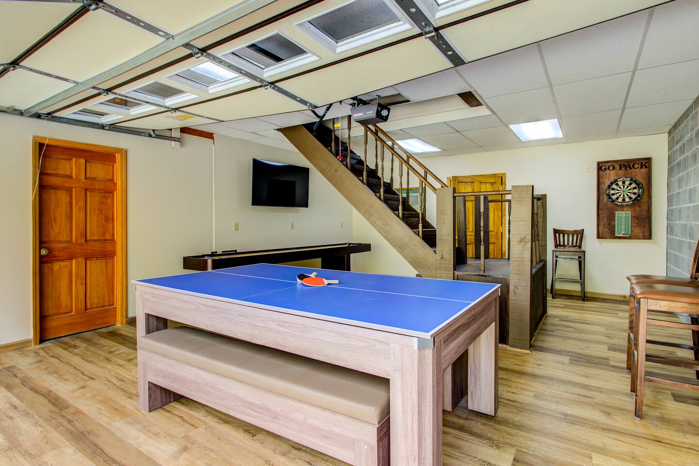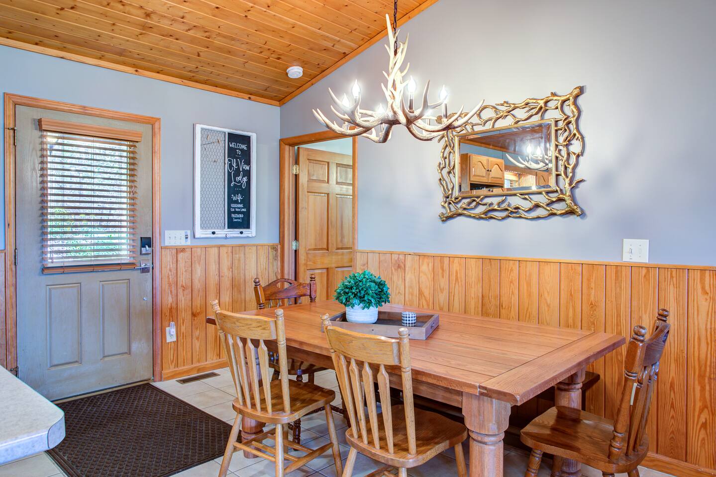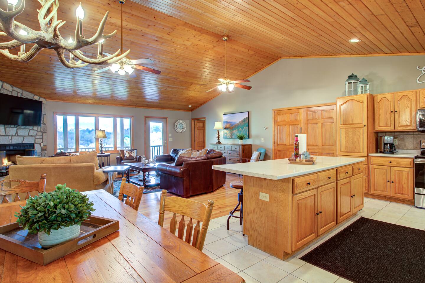 Elk View Lodge has 5 BR/3BA plus a game room. This property can sleep up to 14 guests and is geared towards larger groups or families with two separate kitchens (coffee makers in both). The main level has the Master Bedroom with en suite private bathroom and two additional bedrooms and one bathroom. There is a hot tub located on the top main floor with incredible views of grandfather and sugar mountain. The bottom floor has two bedrooms, one bathroom and a game room. The game room has a pool / ping pong table, shuffleboard and darts. There is a fire pit outside where guests can enjoy with amazing views.
